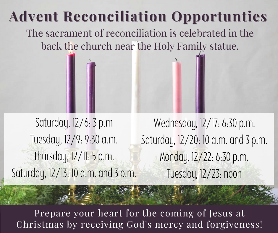During the season of Advent, there are additional opportunities for the sacrament of reconciliation listed below.